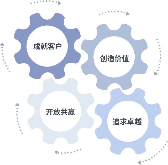 成就客户是一切决策的出发点,,创造价值是衡量所有工作的标准,,追求卓越是我们做事做人的态度,,,,开放共赢是我们的格局也是最终的结果。。。价值观的齿轮环环相扣,,,,推动着组织里的每个人不断向前。。。。